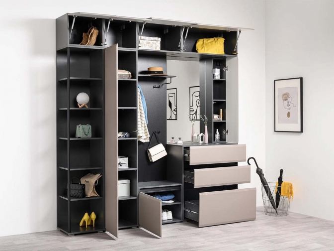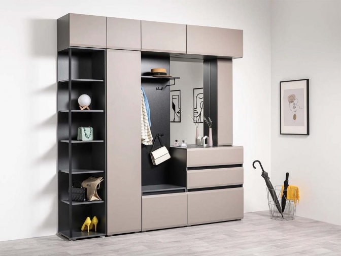 Прихожая Сидней 4 - прихожая с открытым стеллажом, вешалкой, зеркалом и тумбами, где антресольные полки увеличивают полезное пространство, а двухцветное исполнение добавляет интерьеру выразительности.