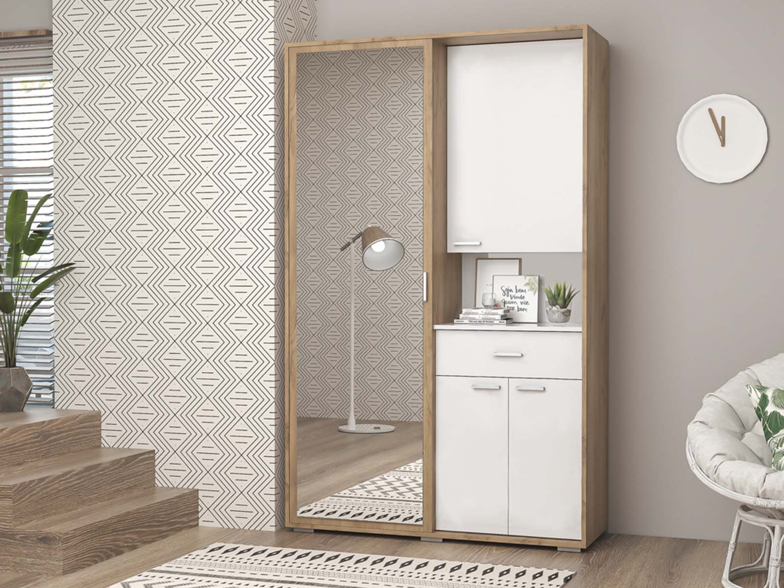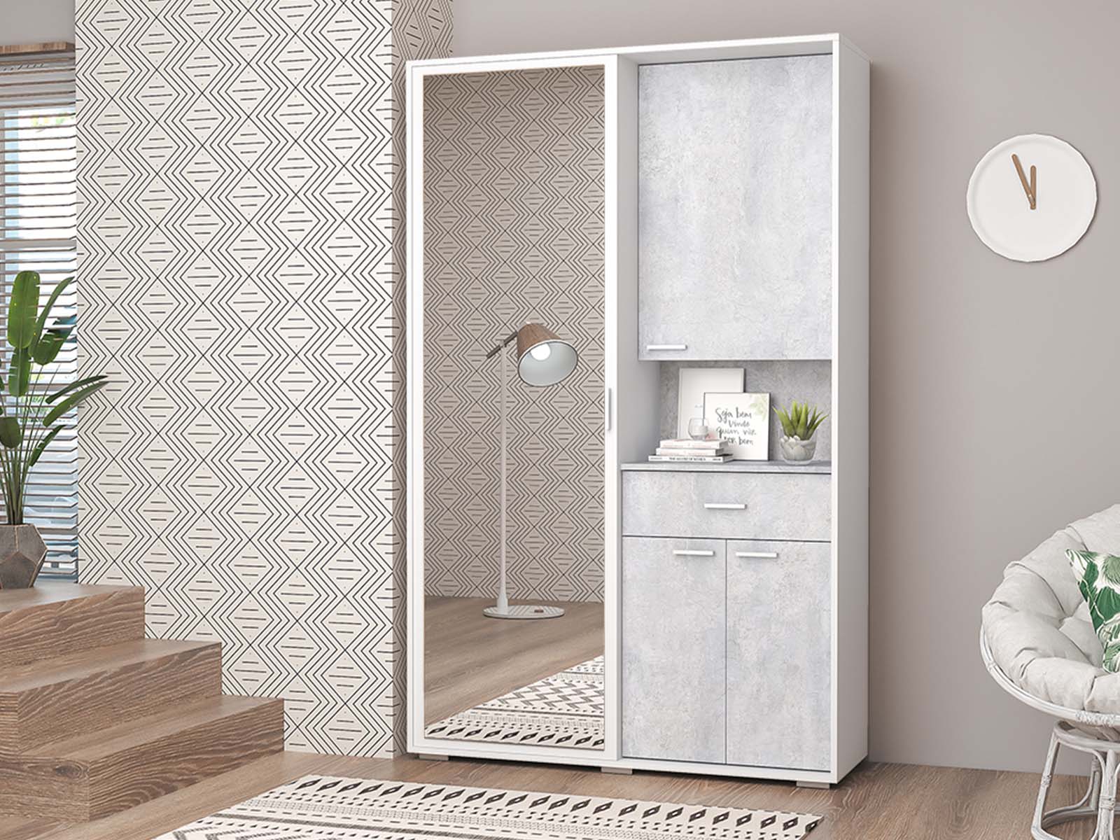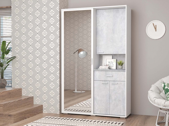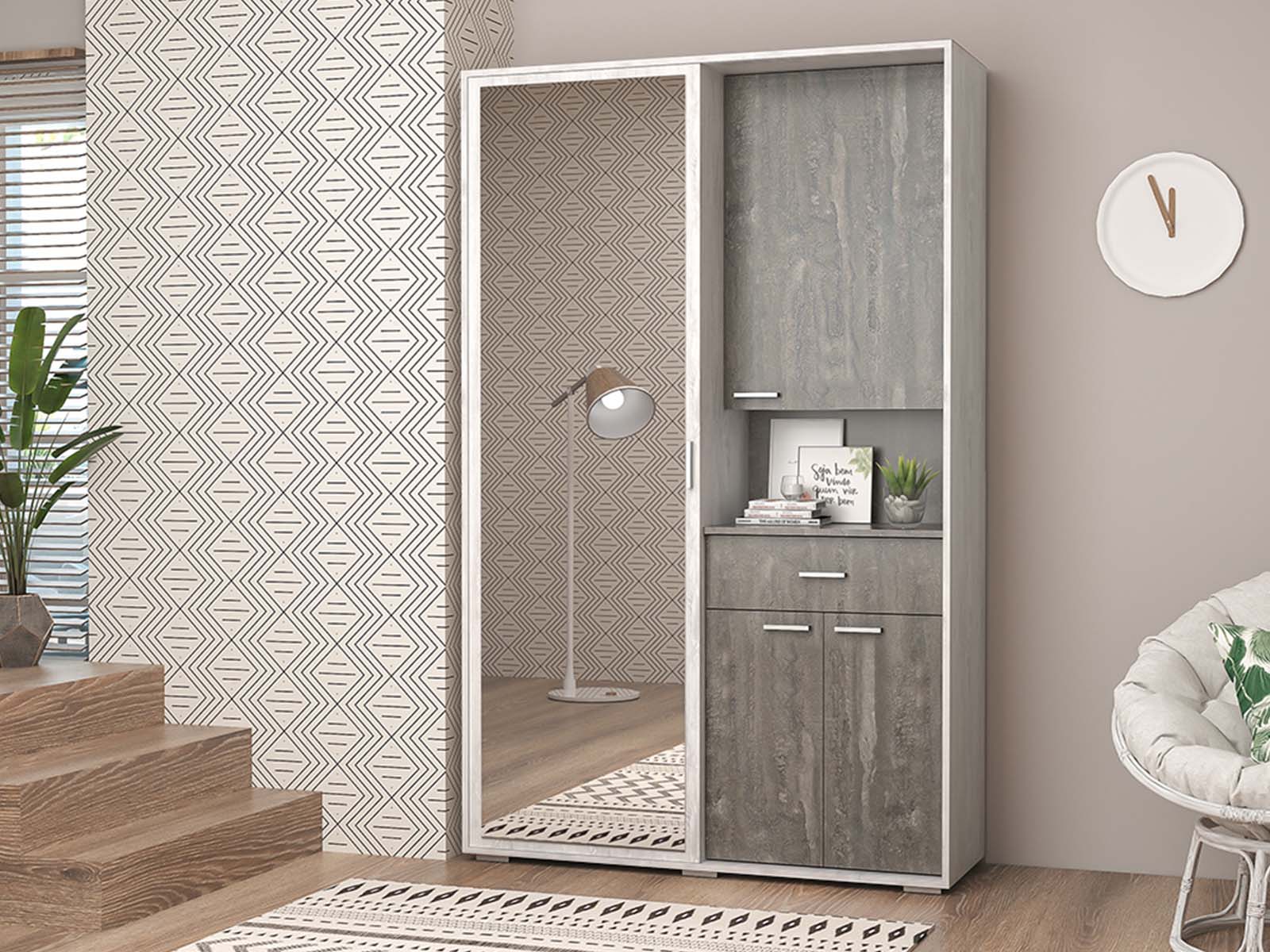 Прихожая Иннэс-3 - с зеркальной раздвижной дверью. Внутри — выдвижная штанга для одежды и ящик на шариковых направляющих. Металлизированные ручки и опоры придают модели современный вид.