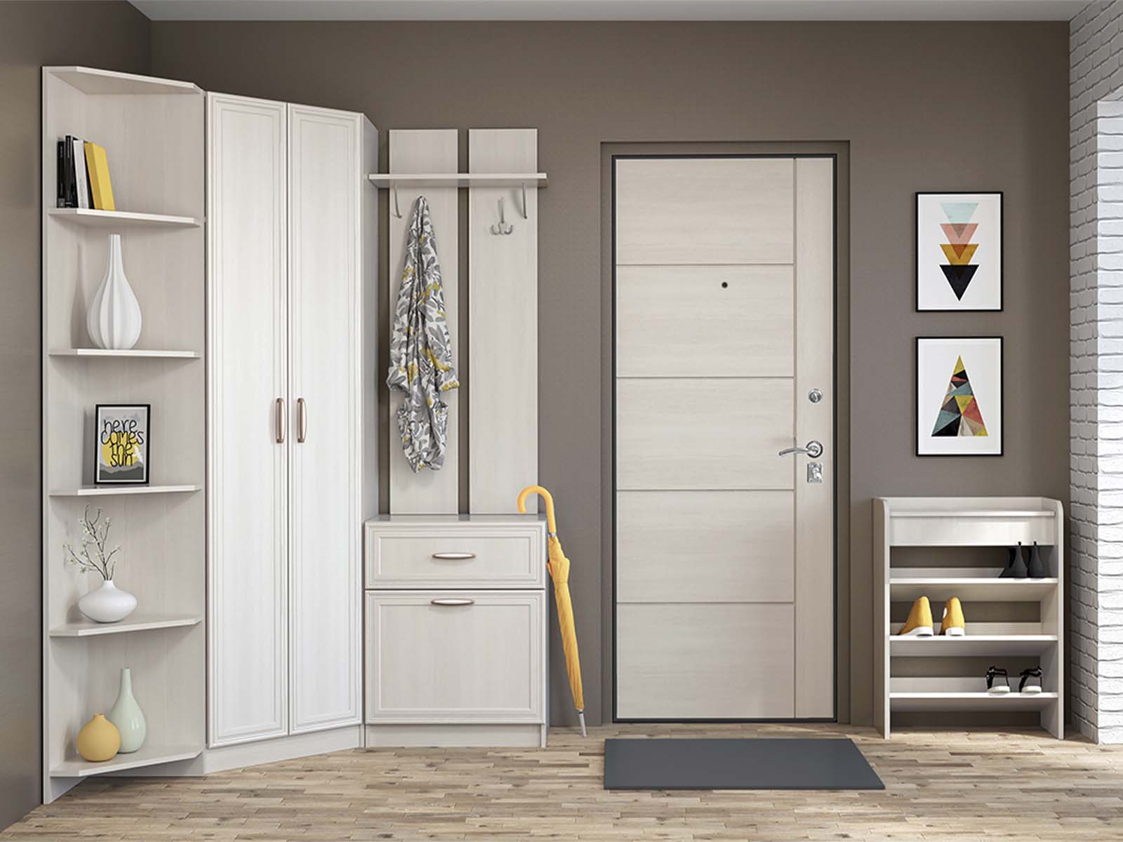 Прихожая Иннэс-6 вариант 1 - Открытая вешалка для повседневной одежды, компактная тумба под обувь и угловой шкаф с двумя глухими дверцами. Внутри шкафа — полки и штанга для плечиков: всё, чтобы верхняя одежда и аксессуары были под рукой, но не на виду. Стильно, функционально и без лишних деталей.