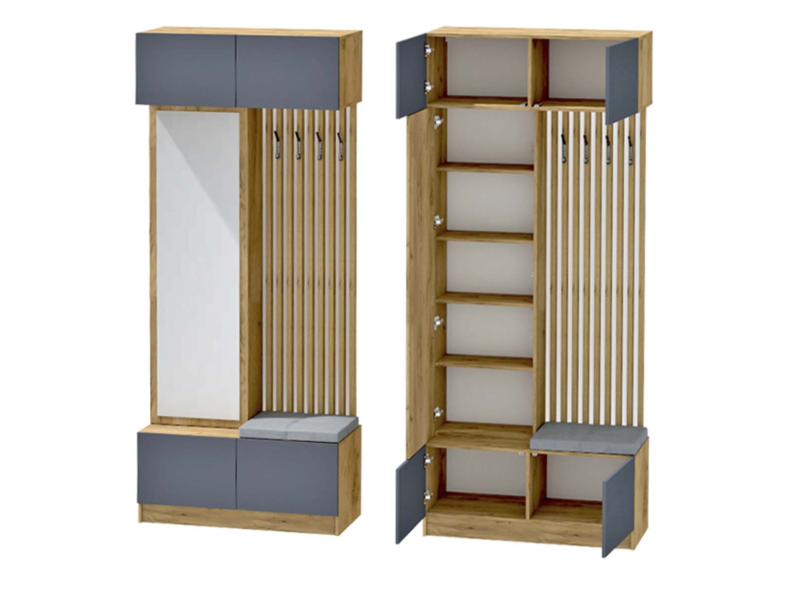 Прихожая Иннэс-10 с зеркалом, дуб крафт золотой/графит - это готовый уголок для встречи и проводов гостей. Комбинированная конструкция объединяет закрытые полки сверху и снизу, пенал с зеркальной дверцей и открытую вешалку для верхней одежды. А мягкое сиденье позволяет удобно переобуться. Всё, что нужно для порядка и уюта в прихожей.