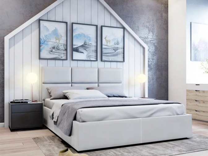 Кровать Венера-5 двуспальная с подъемным механизмом, с мягким изголовьем, ортопедическое основание, ящик для белья, экокожа белая