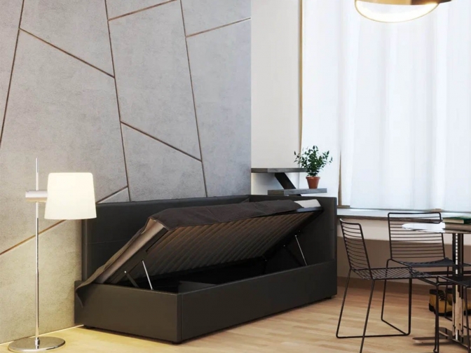 Односпальная кровать Меркурий-1 с подъемным механизмом, с мягким высоким изголовьем, ортопедическое основание, ящик для белья, экокожа черная