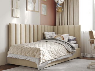 Односпальная кровать Меркурий-3 с подъемным механизмом, с мягким высоким изголовьем, ортопедическое основание, ящик для белья, велюр bingo beige
