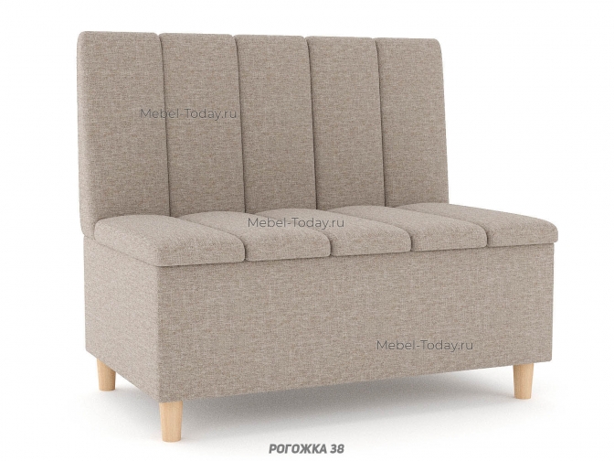 Этот диван выглядит как компактная прямая модель с вертикальной стежкой на спинке и сиденье. Обивка выполнена из мягкой ткани, придающего изделию уютный и стильный вид. Диван установлен на деревянные ножки округлой формы, что добавляет легкости и визуально приподнимает конструкцию.