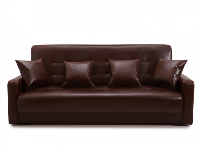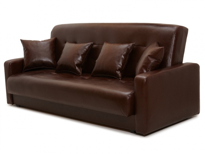Диван книжка Аккорд коричневый – элегантная модель с обивкой из высококачественной эко-кожи станет изюминкой любого интерьера. Для трансформации дивана в кровать используется механизм «книжка», дополнительный комфорт для сна обеспечивает гипоаллергенный материал ППУ. Вещи и постельное белье можно хранить во вместительном нижнем ящике. Декоративные подушки заказываются отдельно.