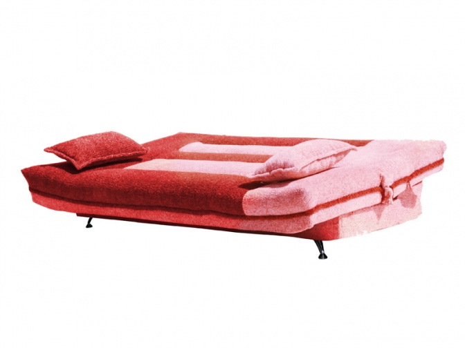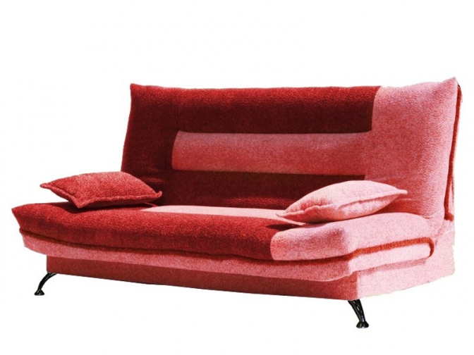 Диван книжка Лодочка велюр красный с хромированными ножками выполнен в ярком стиле. Удобная раскладная модель с механизмом «книжка» легко раскладывается в кровать, в качестве наполнителя установлен беспружинный блок ППУ. Диван не имеет подлокотников, но в комплект входят красивые диванные подушки.