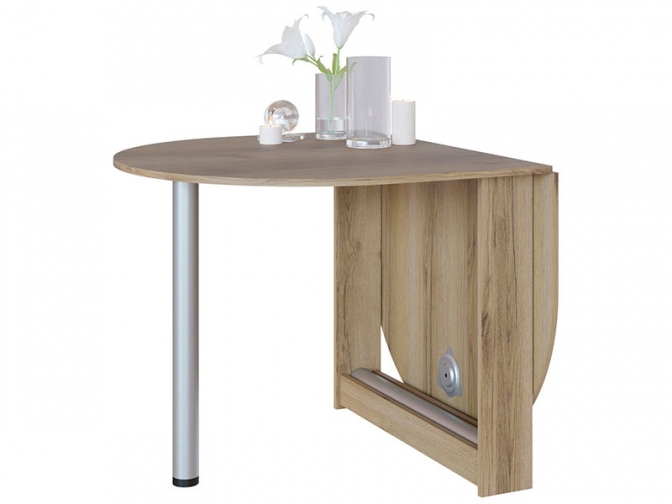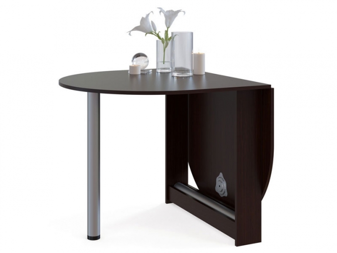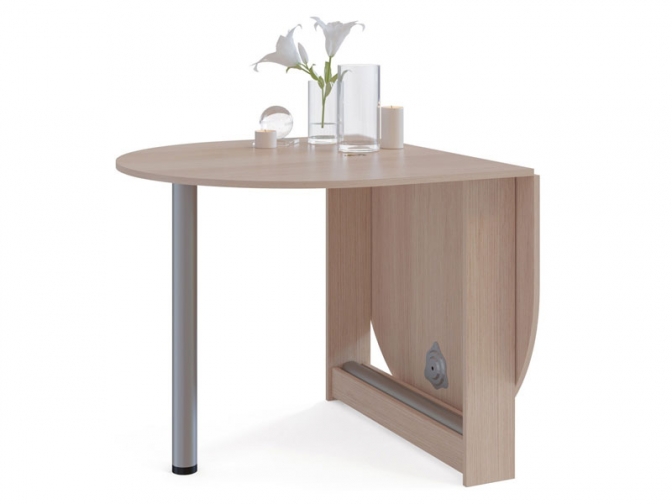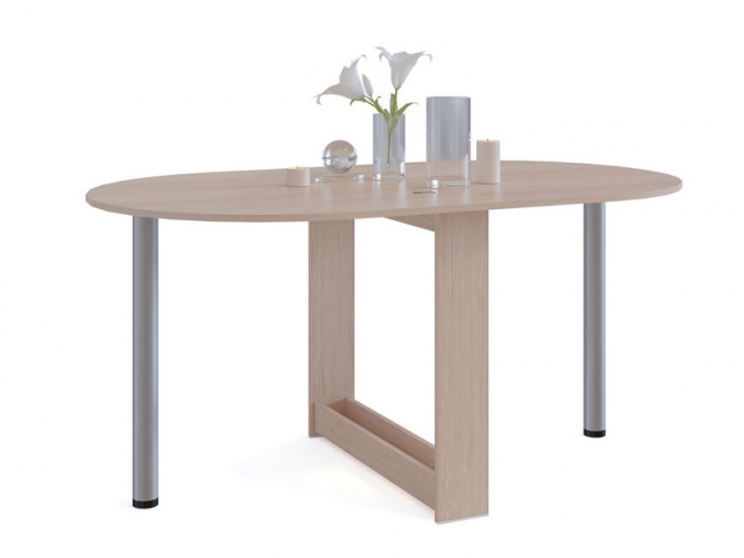 Стол-книжка СП-12 с одной раскладываемой столешницей станет прекрасным дополнением современной обстановки кухни или гостиной. Стильный овальный стол в собранном виде имеет ширину 86 см, что позволяет придвинуть его к стене, не занимая много места. При необходимости раскладная столешница легко поднимается и крепится на металлической опоре, позволяя получить полноценный обеденный стол с шириной в 154,8 см (съемная опора в собранном виде хранится на специальной полке внутри стола).