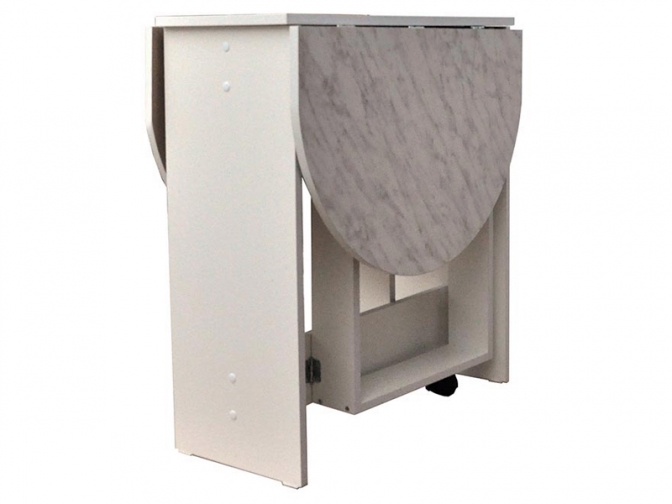 Стол книжка СМ мрамор прекрасно подходит для классической обстановки небольшой кухни. Модель отличается компактными размерами, в собранном виде ее можно использовать в качестве удобной тумбы. Для разборки используются две выдвигающиеся опоры на роликах, при помощи которых крепятся боковые сегменты столешницы.