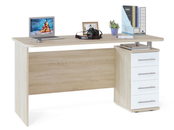 Компьютерный стол КСТ-105.1 имеет слегка закругленную столешницу толщиной 22 мм с кромкой ПВХ. Под столешницей четыре ящика с металлическими направляющими и полка для хранения бумаг. Ручки металлические. Изделие поставляется в разобранном виде, хорошо упаковано в гофротару вместе с необходимой фурнитурой и подробной инструкцией по сборке. Гарантия 2 года.