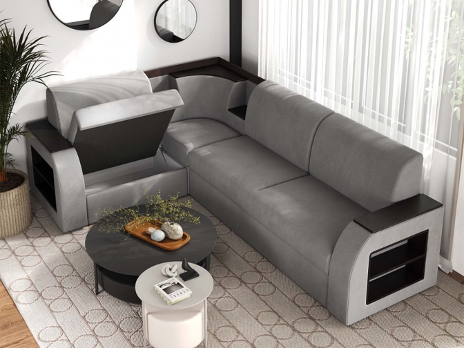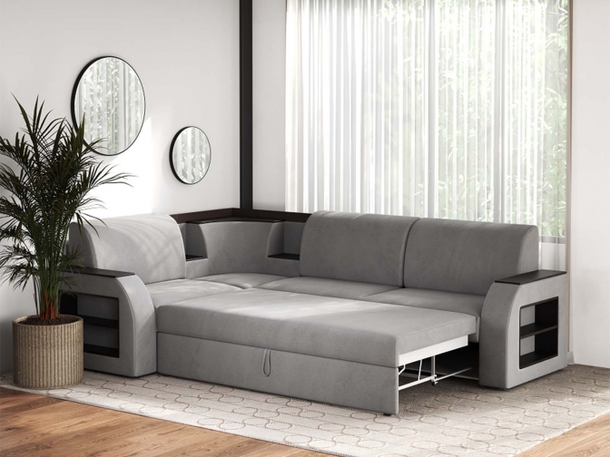 Угловой диван Ника-2 (Классик-23) велюр bingo ash разработан дизайнерами для людей, которые любят и ценят комфорт. В конструкции угловой мягкой мебели предусмотрено наличие небольших ниш, оборудованных как полки и импровизированные столики, модель комплектуется съемной деревянной накладкой. Универсальный диван можно использовать, как комфортабельную первоклассную кровать или как усовершенствованное, рационально оборудованное рабочее место с подставкой для ноутбука, деловых бумаг и чашки кофе.
