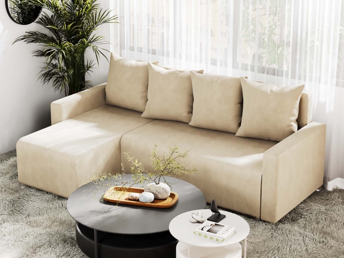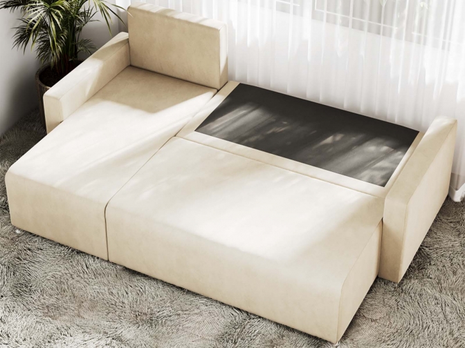 Угловой диван Каир велюр bigno beige выполнен в элегантном стиле, это прекрасное решение для современной спальни или гостиной. Диван легко разбирается в двуспальную кровать, благодаря системе «еврокнижка», комфортный отдых обеспечивает беспружинный матрас на основе ППУ, сохраняющий свою форму даже при больших нагрузках. Под сиденьем оборудован отсек для белья, в комплект включены декоративные подушки.