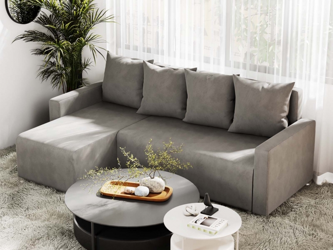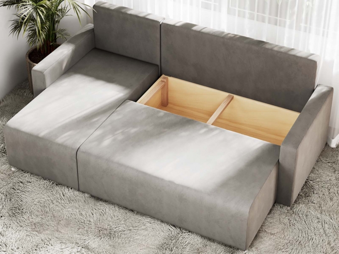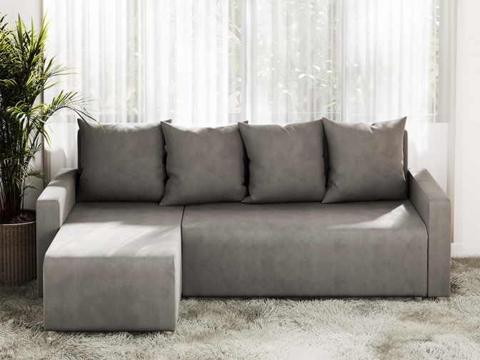 Угловой диван Каир велюр bigno grey выполнен в элегантном стиле, это прекрасное решение для современной спальни или гостиной. Диван легко разбирается в двуспальную кровать, благодаря системе «еврокнижка», комфортный отдых обеспечивает беспружинный матрас на основе ППУ, сохраняющий свою форму даже при больших нагрузках. Под сиденьем оборудован отсек для белья, в комплект включены декоративные подушки.