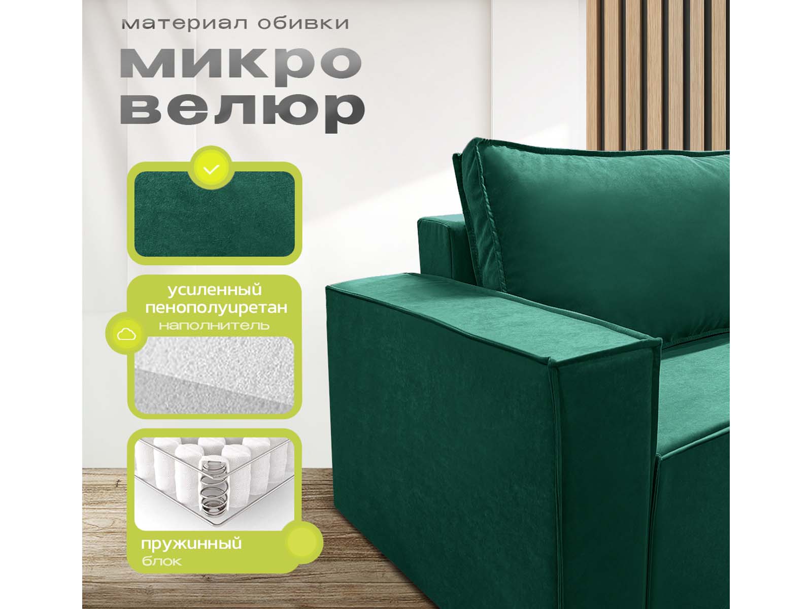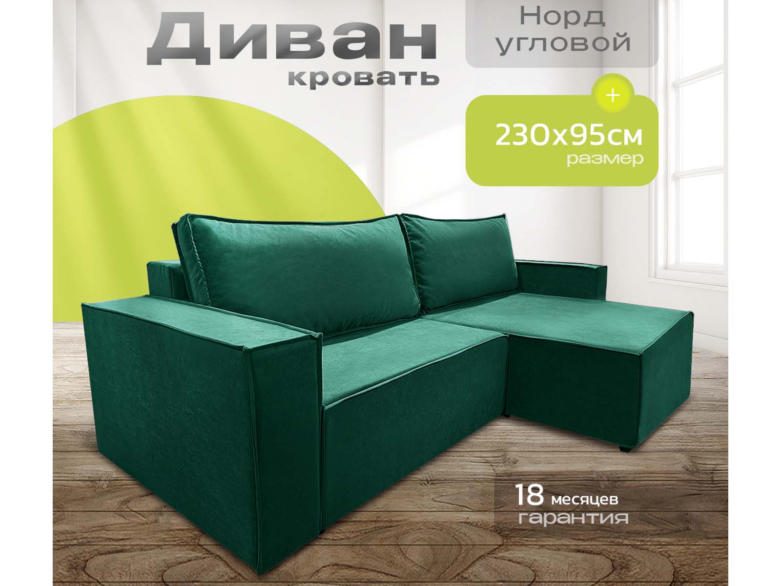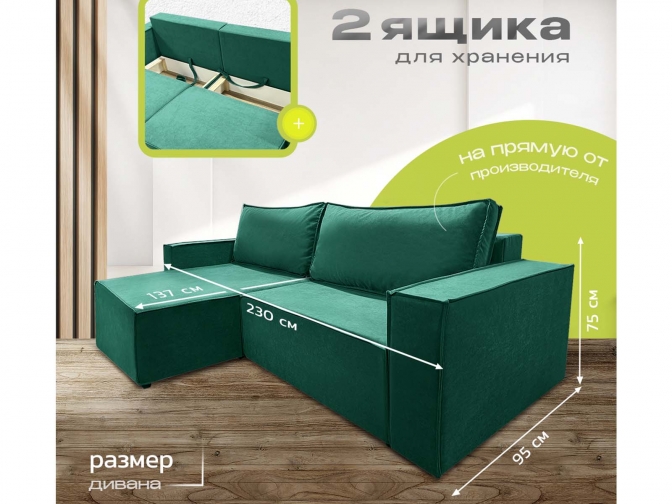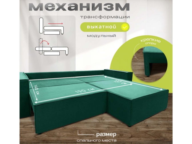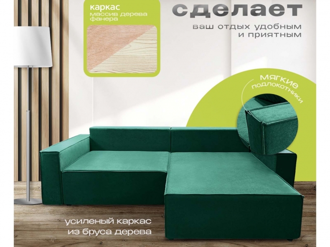 Диван угловой Норд-Лофт, блок независимых пружин, еврокнижка, велюр зеленый - стильное и практичное решение в стиле лофт с просторным спальным местом 140×190 см для ежедневного использования. Оснащён надёжным механизмом «еврокнижка», ортопедическим независимым пружинным блоком и вместительным ящиком для белья. Прочный каркас из массива и фанеры, износостойкий велюр/плюш и большой выбор обивки обеспечивают долговечность, комфорт и индивидуальный дизайн.
