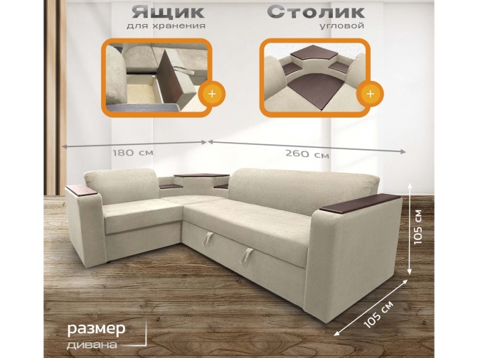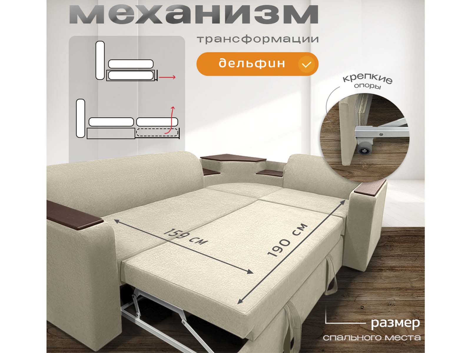 Диван угловой Спенсер, усиленный ППУ, дельфин, велюр бежевый - стильное и функциональное решение для гостиной, легко трансформируется в просторное спальное место размером 260×180 см. Практичный дизайн с удобными подлокотниками и вместительными ящиками для хранения обеспечивает комфорт и экономию пространства.