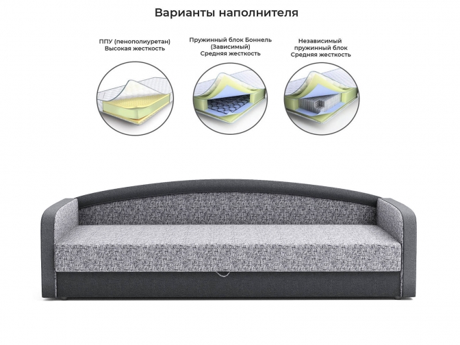 Настил мягких элементов: ППУ. Можно заменить на пружинный блок BONNEL или ортопедический матрас (блок независимых пружин) с доплатой.