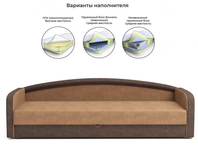 Настил мягких элементов: ППУ. Можно заменить на пружинный блок BONNEL или ортопедический матрас (блок независимых пружин) с доплатой.