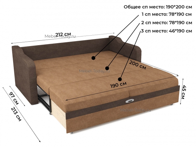 Модель можно раскладывать тремя разными способами, получается три три варианта спального места:
