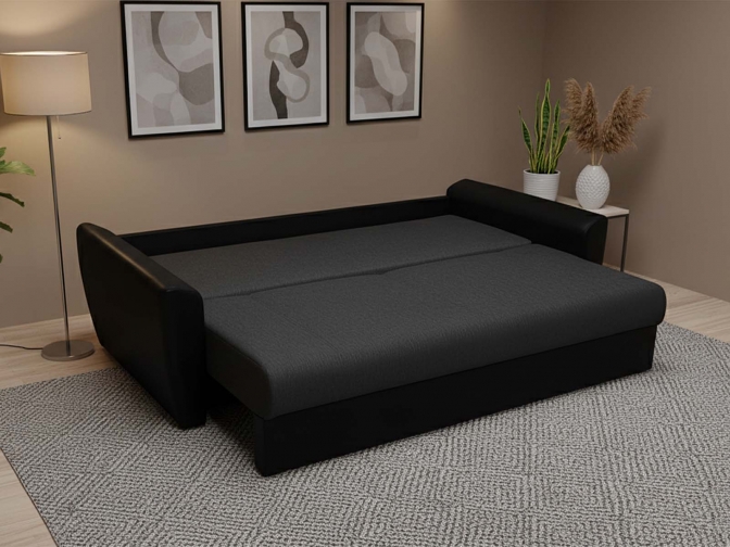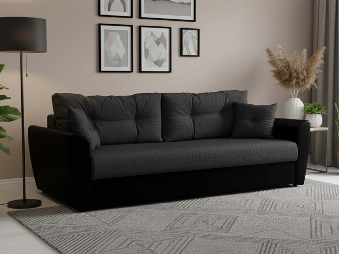 Диван Еврокнижка АМСТЕРДАМ Черный выполнен в традиционном классическом стиле. Прямой, очень удобный диван оборудован невысокими подлокотниками. Полноценный, здоровый отдых обеспечивает наполнитель в виде блока пружин Боннель и материала ППУ, обладающего высокоэластичными свойствами. Трансформацию дивана в кровать можно выполнить, используя надежный механизм «еврокнижка».