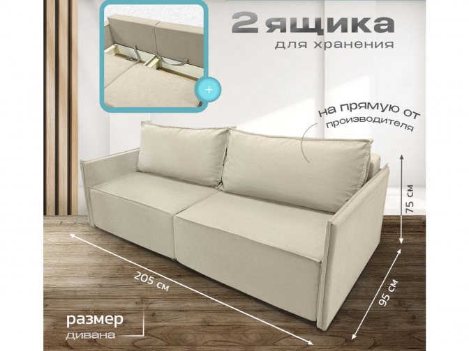 Диван Норд-Лофт 2.0 с узкими подлокотниками бежевый, еврокнижка, ортопедический, велюр или бархат