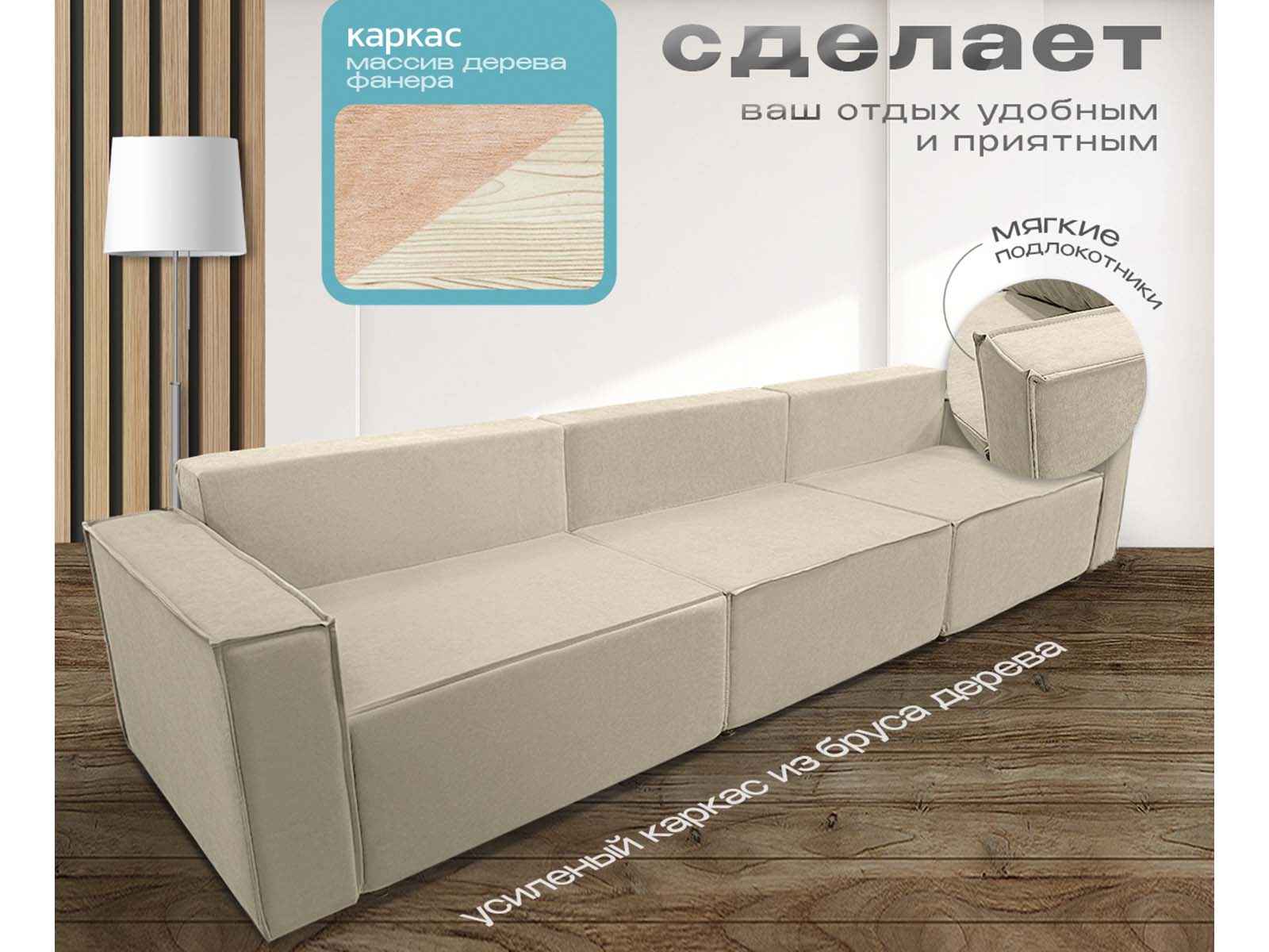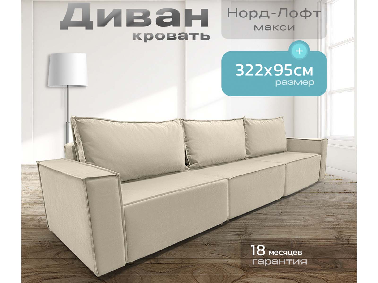 Диван Норд-Лофт Макси бежевый, еврокнижка, ортопедический, велюр или бархат