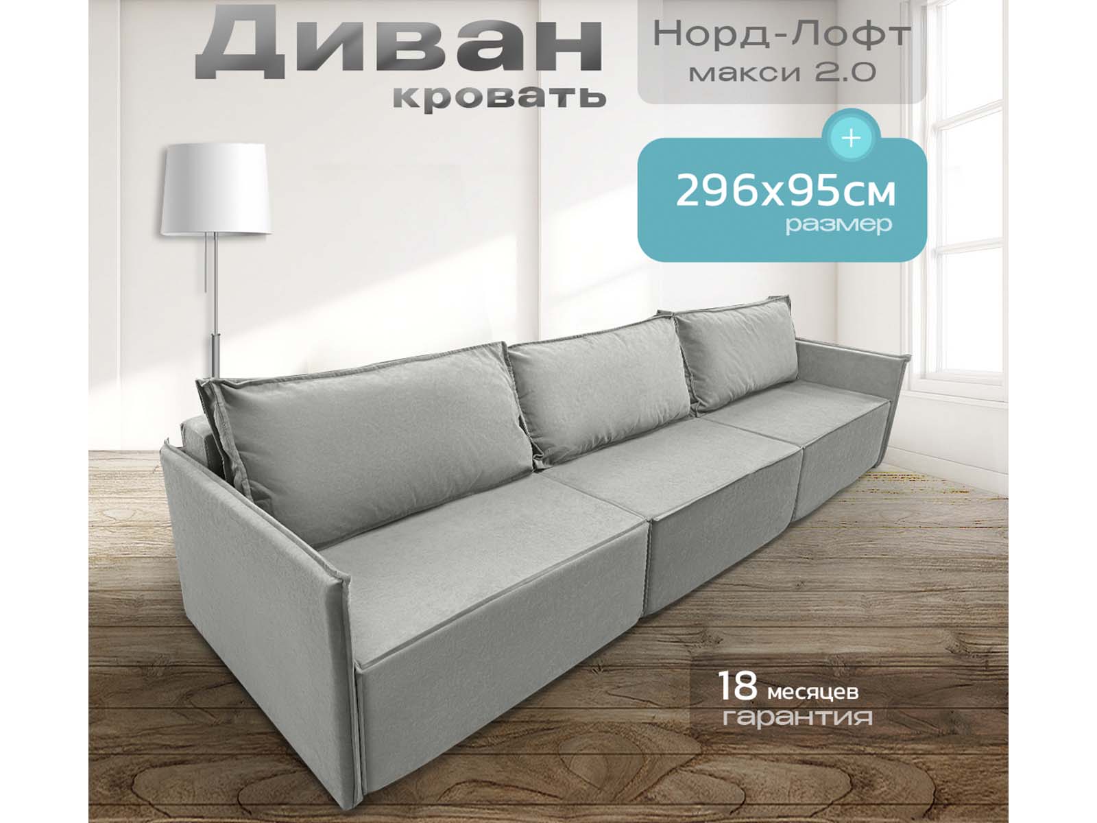 Диван Норд-Лофт Макси 2.0 светло-серый, еврокнижка, ортопедический, велюр или бархат