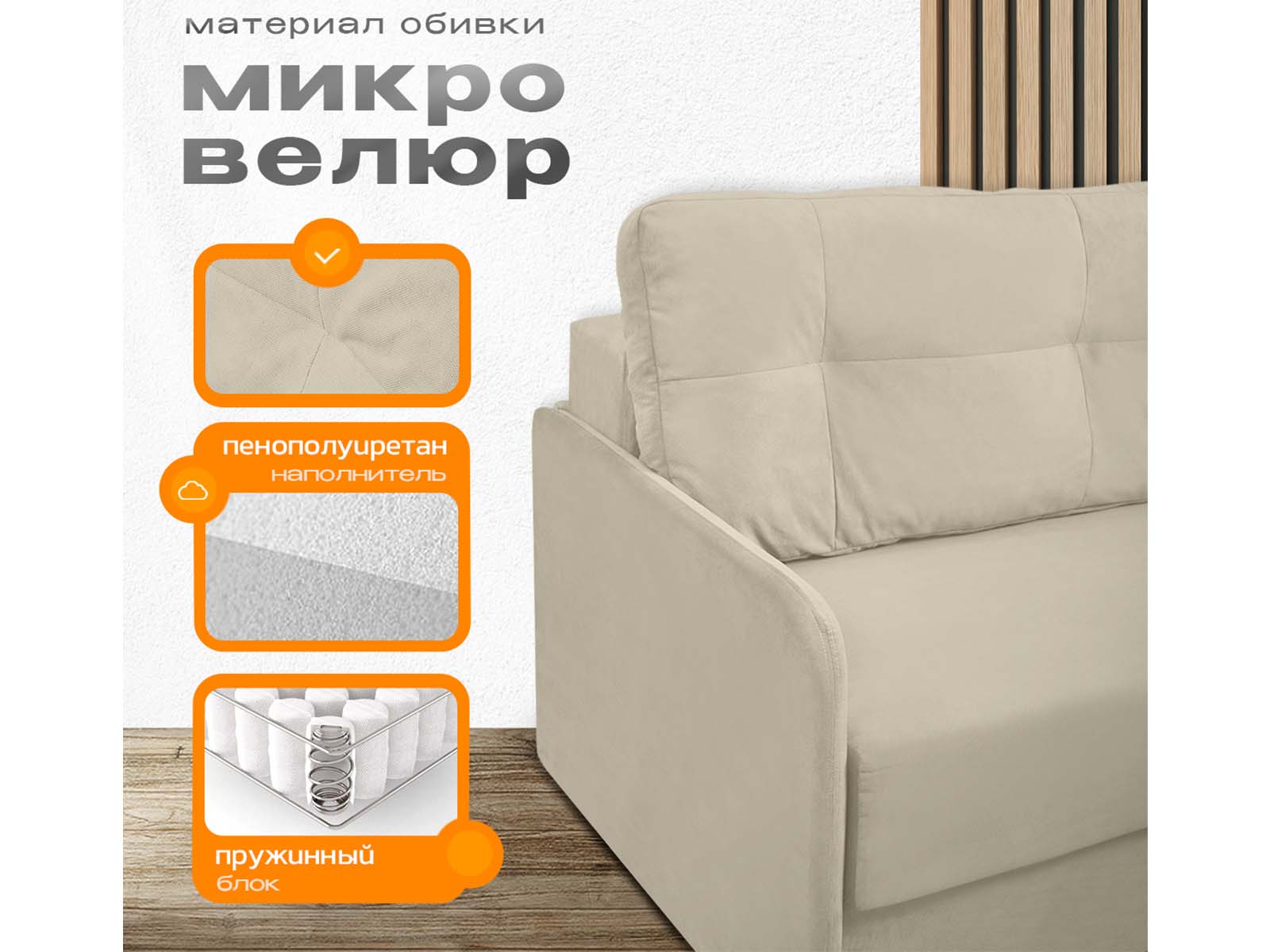 Диван Леон бежевый, еврокнижка, ортопедический, велюр или бархат
