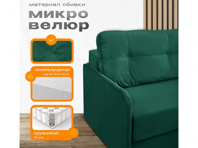 Диван Леон зеленый, еврокнижка, ортопедический, велюр или бархат