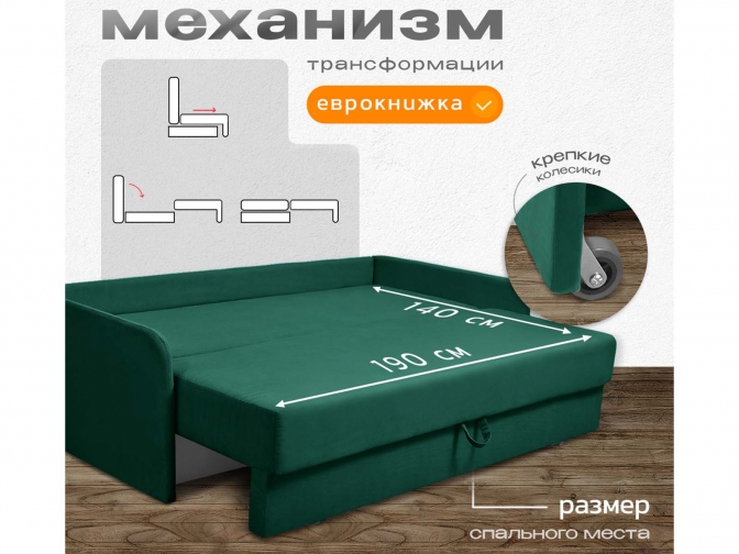 Диван Леон зеленый, еврокнижка, ортопедический, велюр или бархат — раскладной диван, который умеет экономить пространство, не теряя в удобстве. Компактный в сложенном виде, он легко превращается в полноценное спальное место, а встроенные ящики для белья помогают забыть о бардаке. Лаконичный дизайн впишется и в студию, и в уютную дачную гостиную. Умный выбор для тех, кто ценит порядок и комфорт без лишних метров.