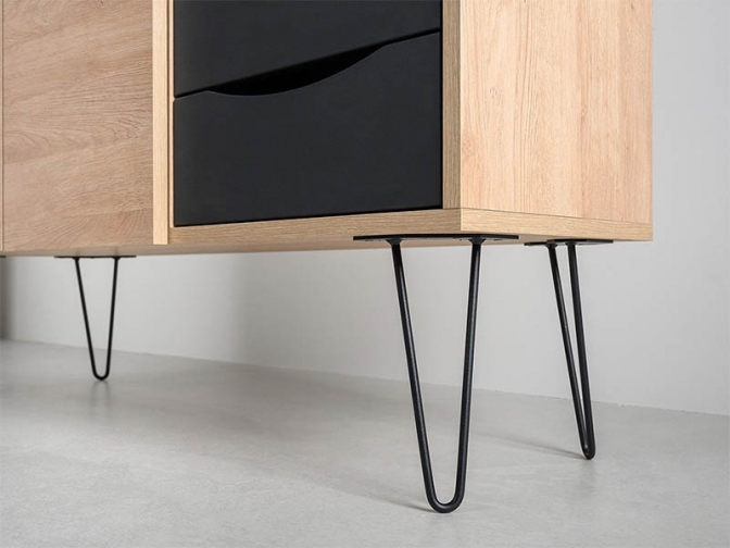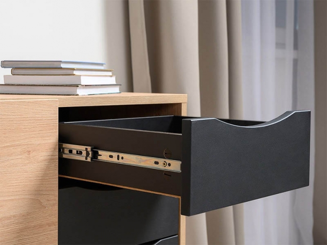 Конструкция на черных металлических опорах, ящики на шариковых направляющих.