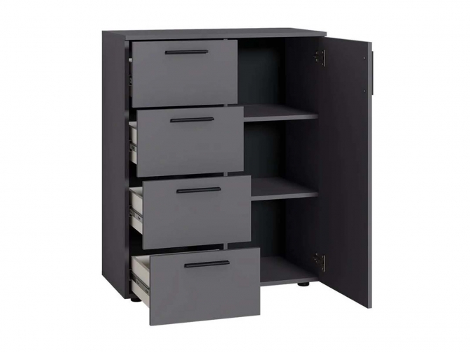 Комод Эйр 16.241 Графит - с глухой дверцей, тремя полками и четырьмя выдвижными ящиками идеально впишется в современный интерьер. Функциональность и лаконичный дизайн делают его практичным решением для хранения.