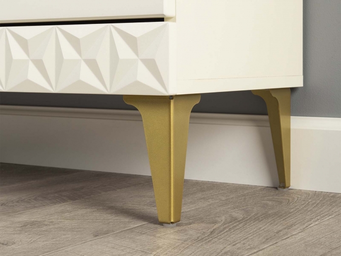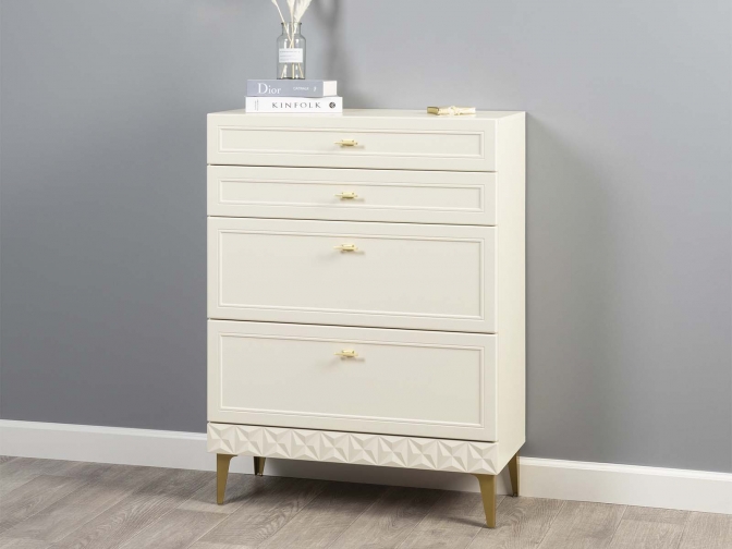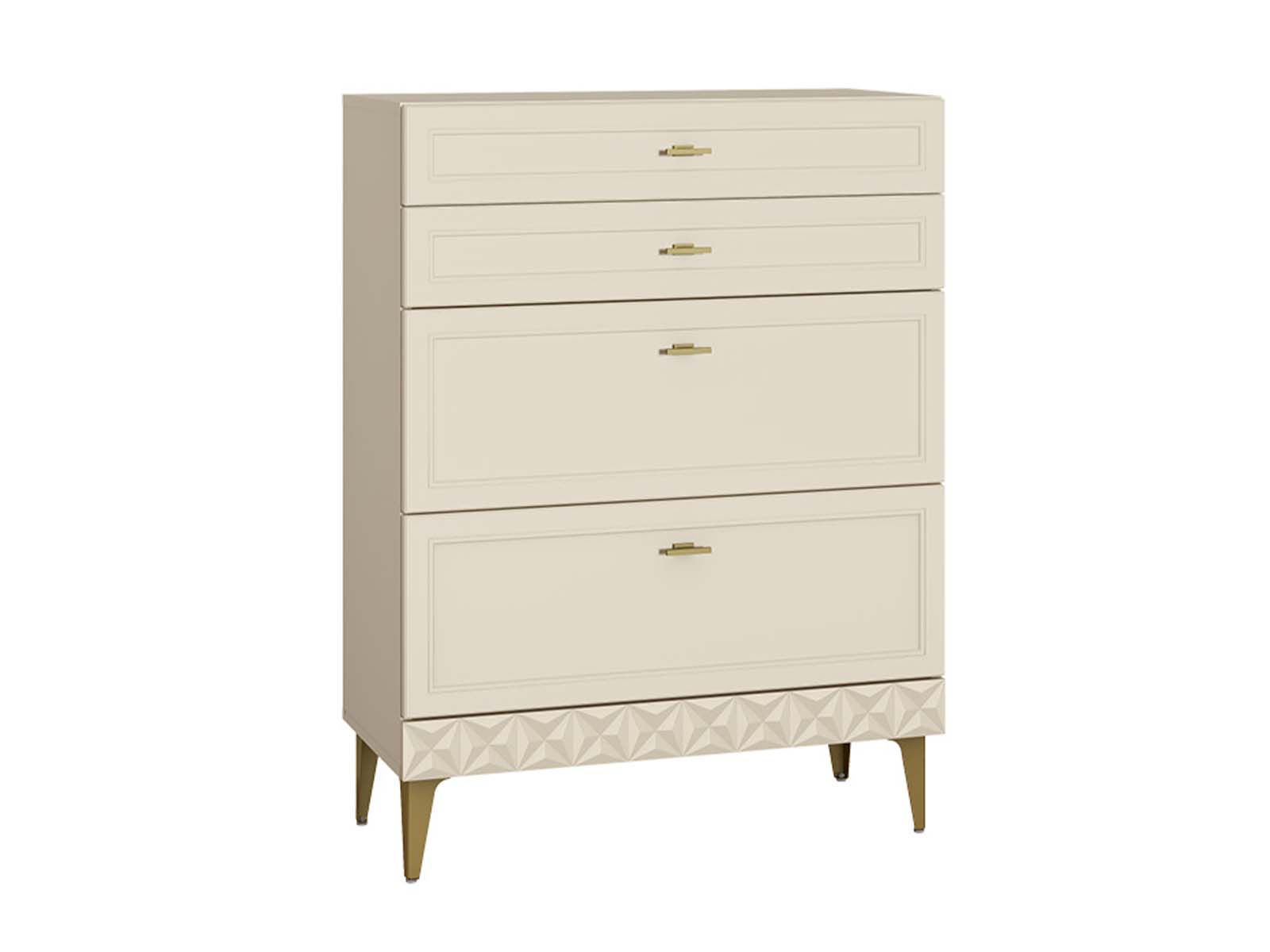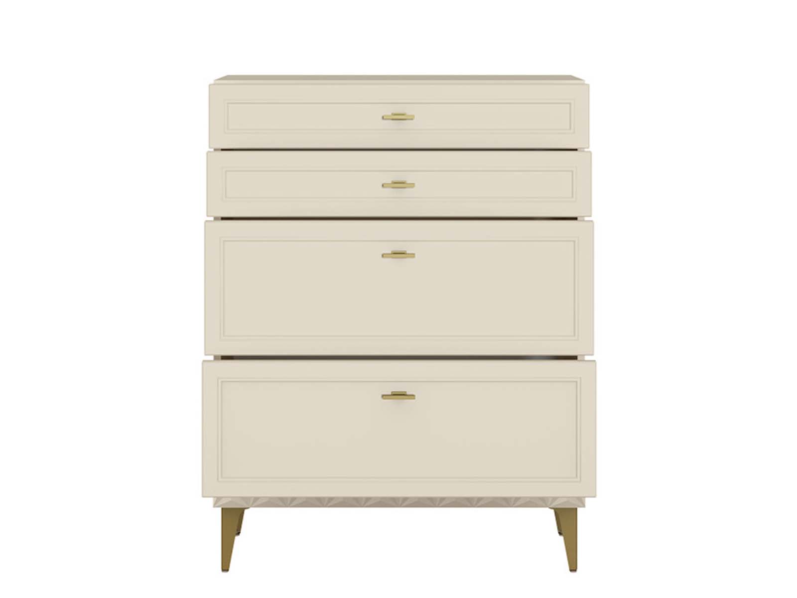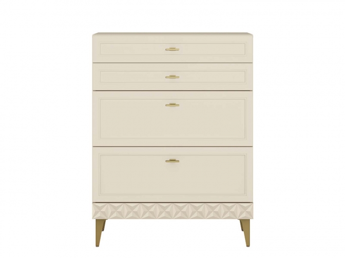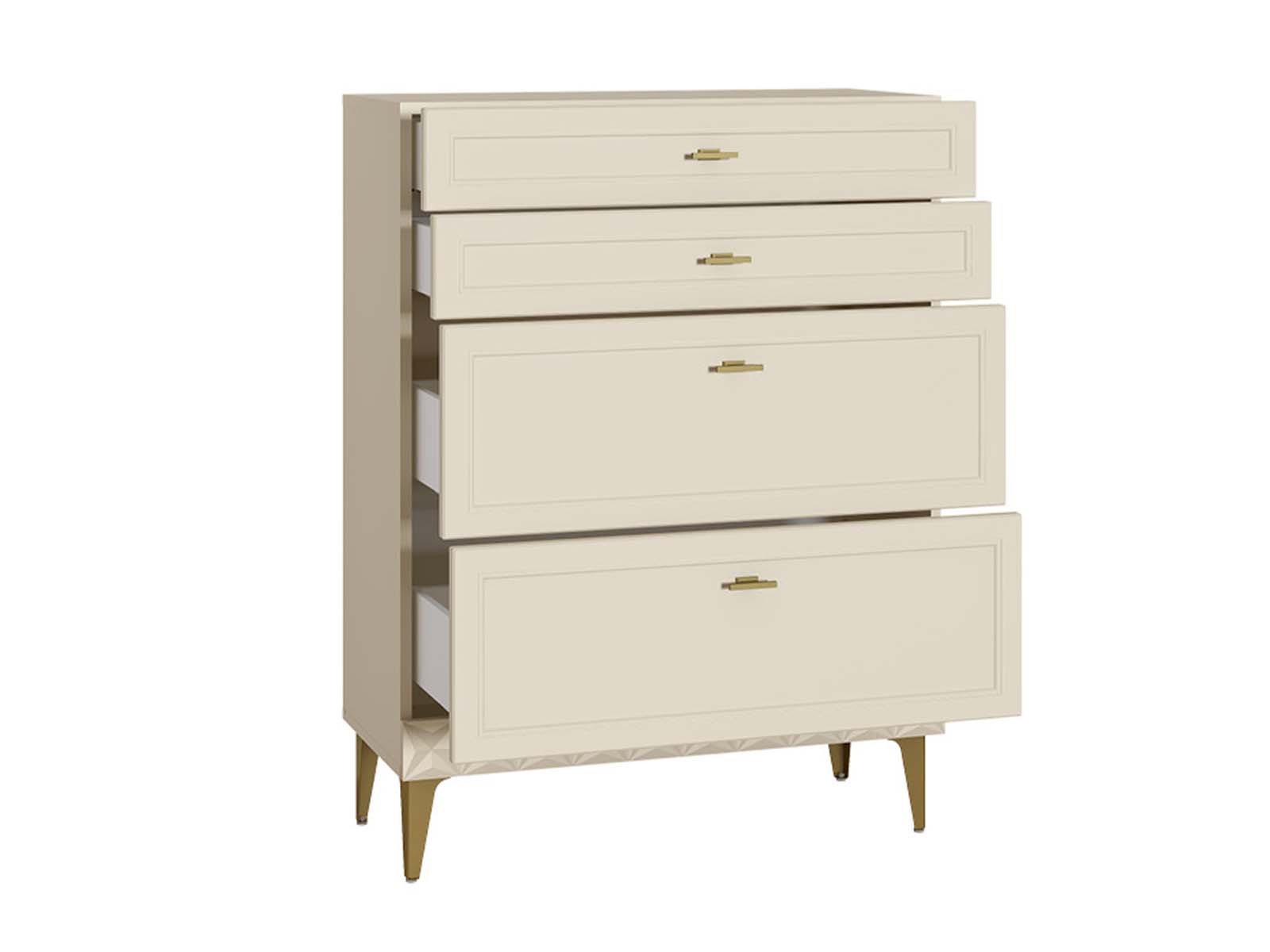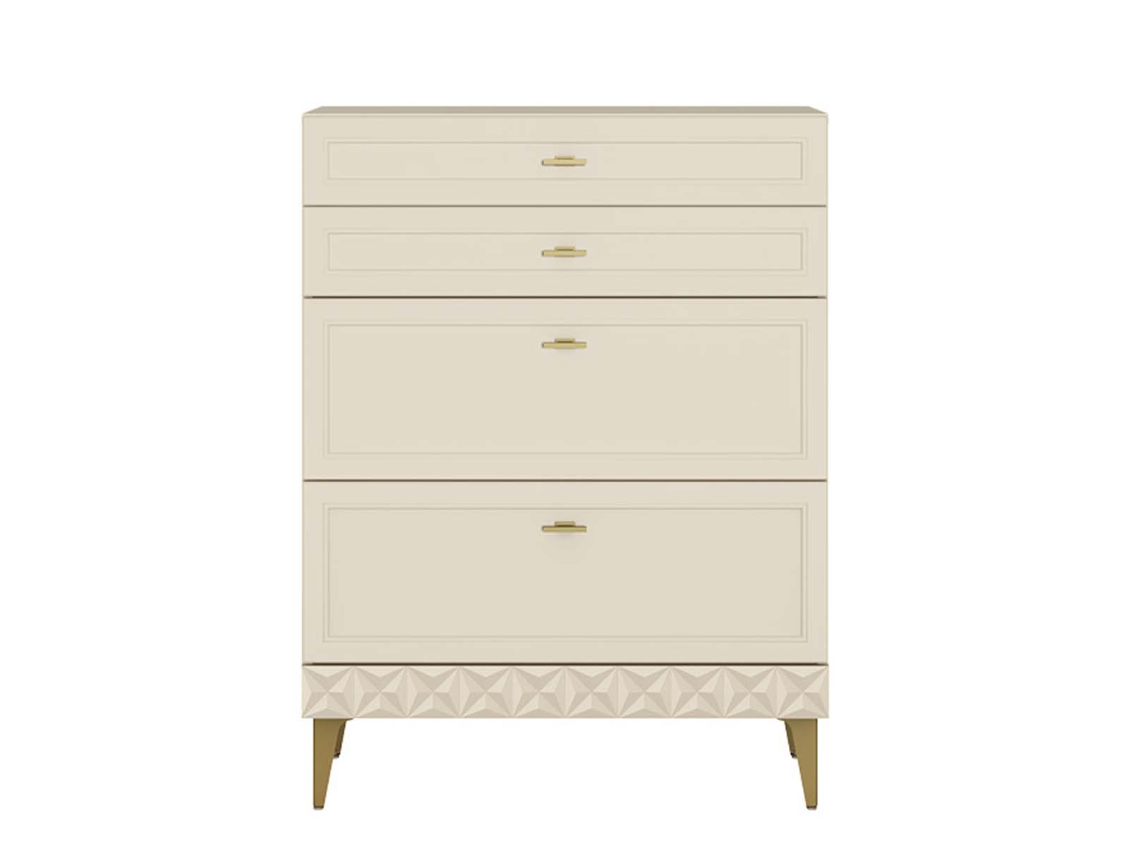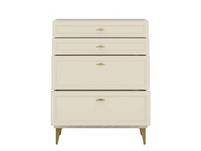 Комод Марион 16.249 Слоновая кость - комод с характером для современных пространств. Четыре вместительных ящика разной глубины, фасады с детальной отделкой и акценты из матового металла (ручки, ножки) создают гармоничный баланс дизайна и функциональности.