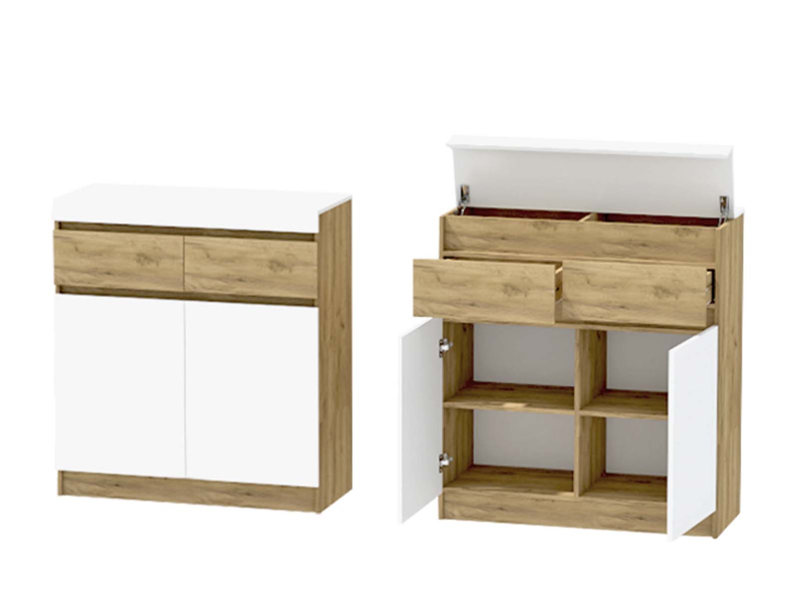 Комод Иннэс-10, дуб крафт золотой/белый - это функциональный центр в вашей гостиной или спальне. Верхняя откидная столешница скрывает удобный ящик для мелочей, два выдвижных ящика в центре готовы принять бельё или документы, а закрытые полки внизу помогут сохранить порядок. Стильно, продуманно, по-домашнему уютно.