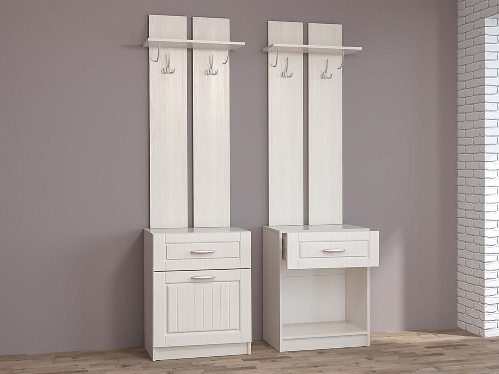 Обувница с вешалкой Иннэс-6 МДФ - объединяет место для верхней одежды с антресольной полкой и удобную систему хранения обуви с выдвижным ящиком на шариковых направляющих полного выдвижения и откидной створкой. Ручки из пластика.