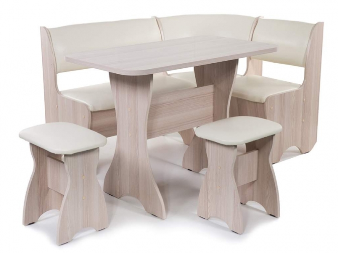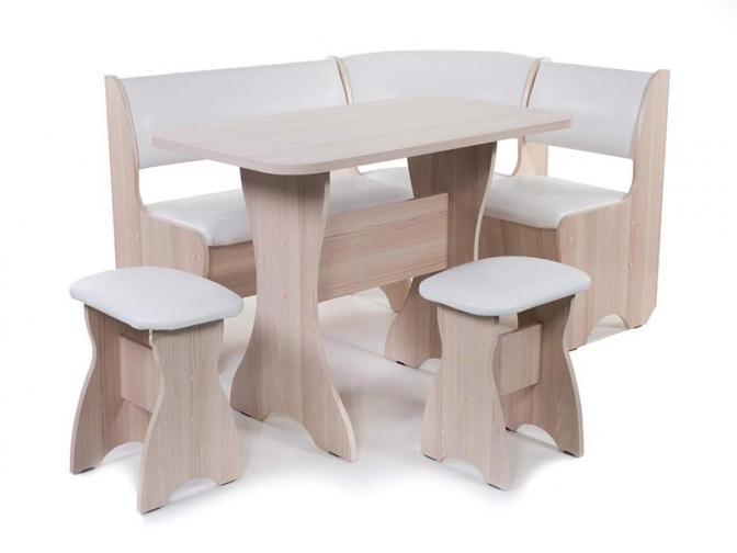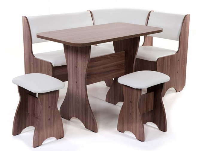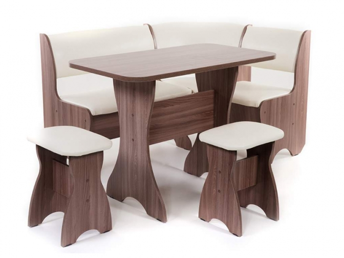 Кухонный набор Тюльпан 1 категория – это компактный гарнитур, в состав которого включены обеденный стол, угловой диван с мягкими сиденьями и спинкой, два табурета с мягкими сиденьями на фигурных опорах. Столешница термостойкая, изготовлена из специального пластика. Дополнительно диван укомплектован двумя ящиками для различных вещей.