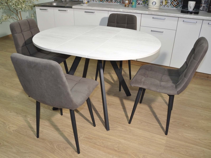 Обеденная группа Нарди Бетон белый/черный - стол и четрые стула. Идеальное сочетание для кухни или столовой. Практичность и гармония в каждой детали.