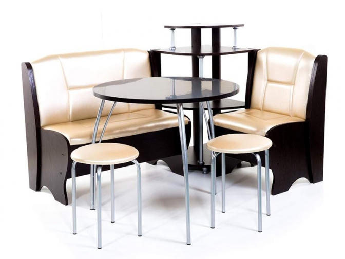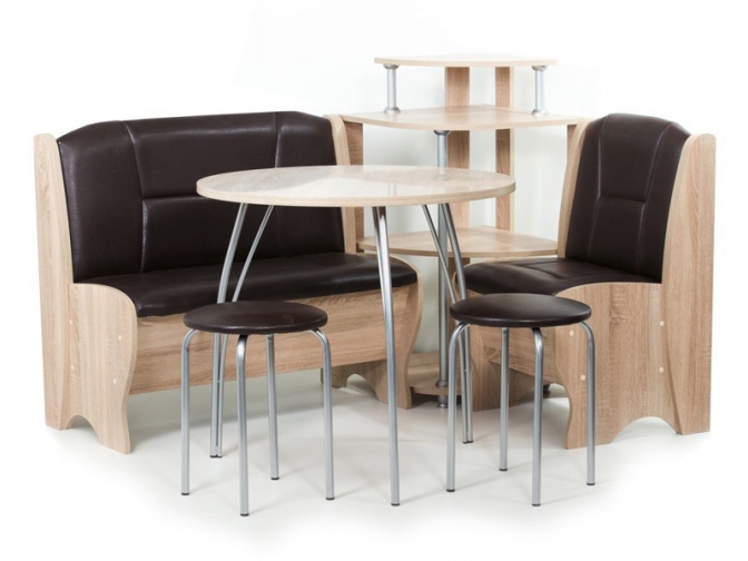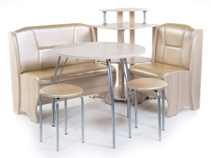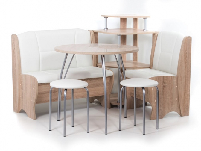 Кухонный набор Лотос 2 категория отлично подойдет для современной комфортной кухни. В состав набора входит трехместный диван с мягкими сиденьями и спинками, угловой столик с разноуровневыми полками для напитков, конфетниц, корзинок с фруктами. Дополняют гарнитур круглый столик и два небольших табурета с мягкими круглыми сиденьями.