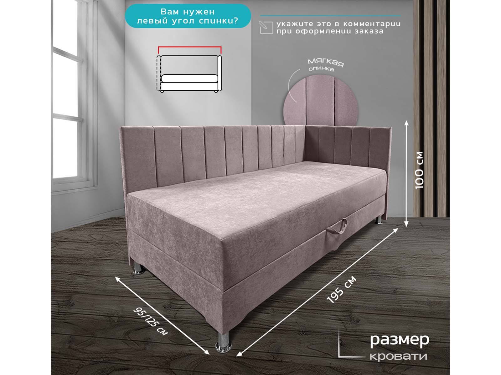 Можно заказать со спальным местом 90, 120, 140 или 160 см.