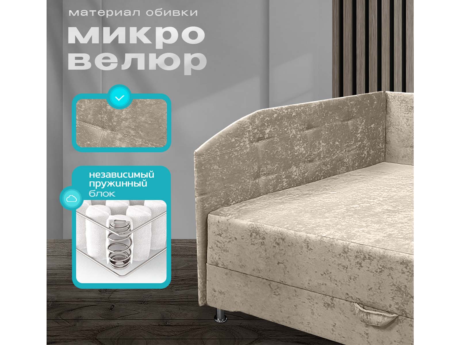 Диван тахта Олсен 4 угловая, с ящиком для белья, независимый пружинный блок, обивка велюр бежевый