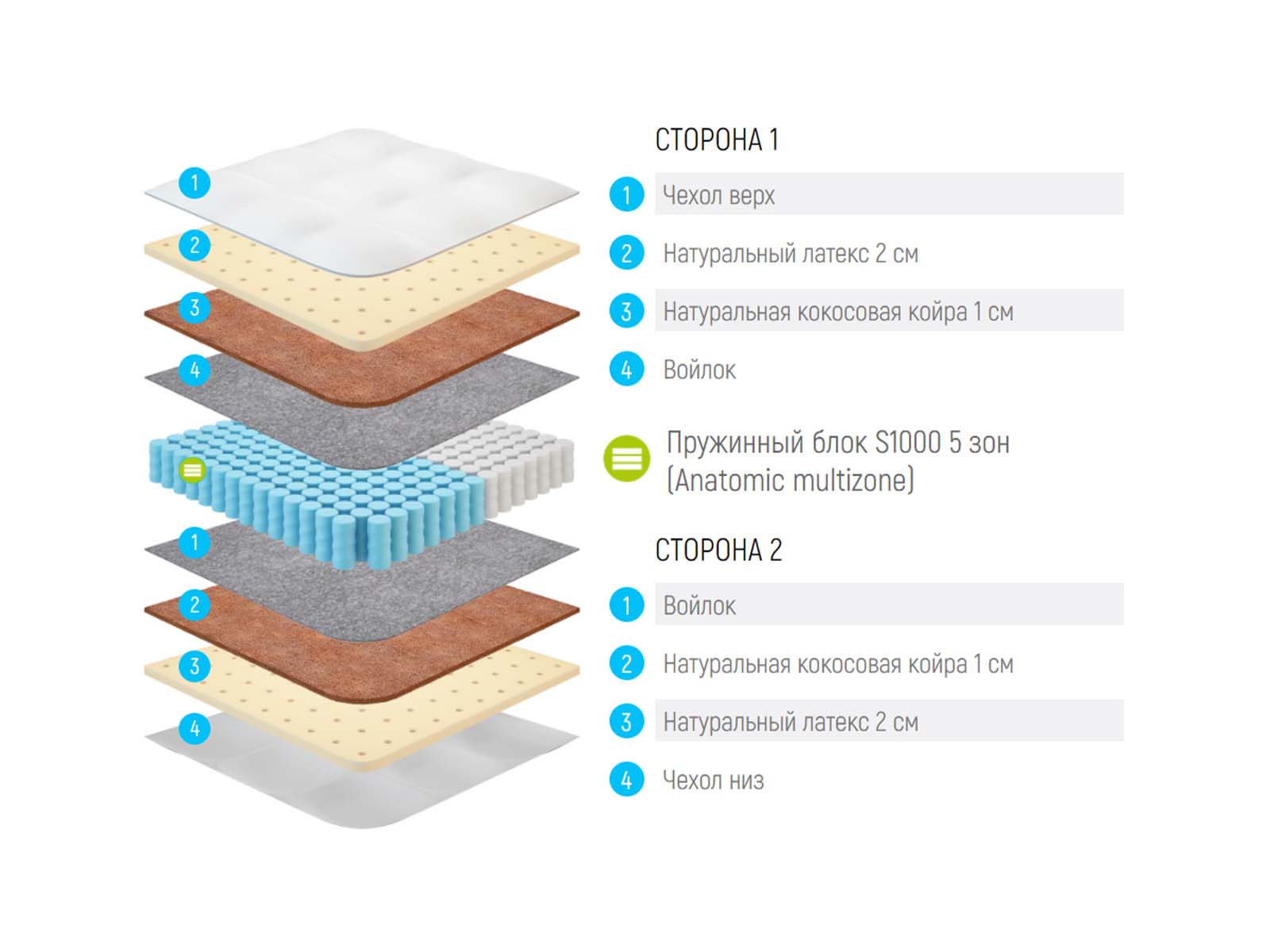 Матрас Lonax Medium Light S1000 5 Zone (Лонакс Медиум Лайт C1000 5 зон) - предлагает классическую среднюю жёсткость благодаря натуральным материалам. Кокосовая койра обеспечивает надежную поддержку позвоночника, а натуральный латекс смягчает поверхность, точно повторяя контуры вашего тела для полного расслабления мышц.