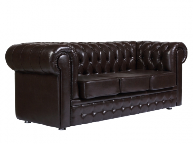 Диван Честер 3- х местный коричневый придаст обстановке офиса черты солидности и элегантности. Трехместный диван с обивкой из искусственной кожи отличается широкими подлокотниками и низкой спинкой, упругими подушками в качестве сиденья. Наполнитель из ППУ обеспечивает комфорт и удобство. Дизайн дивана классический, он дополнен изящной каретной обтяжкой.