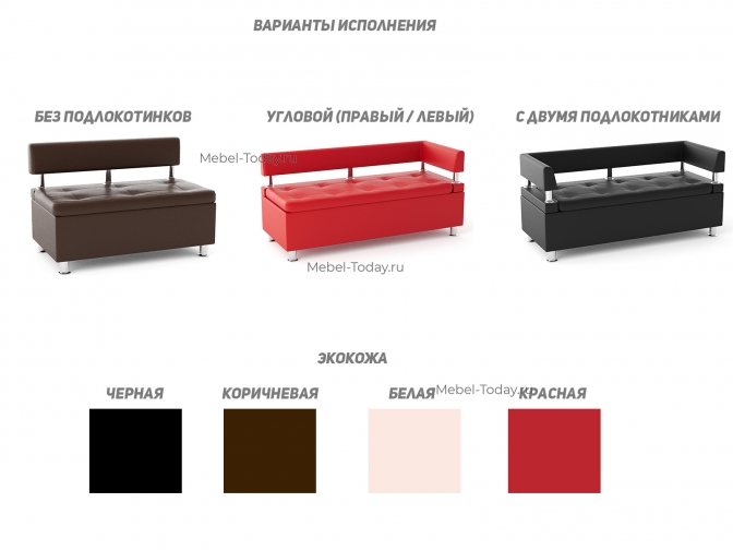 Обивка из износостойкой экокожи представлена в четырех цветах на выбор: коричневый, черный, белый и красный.