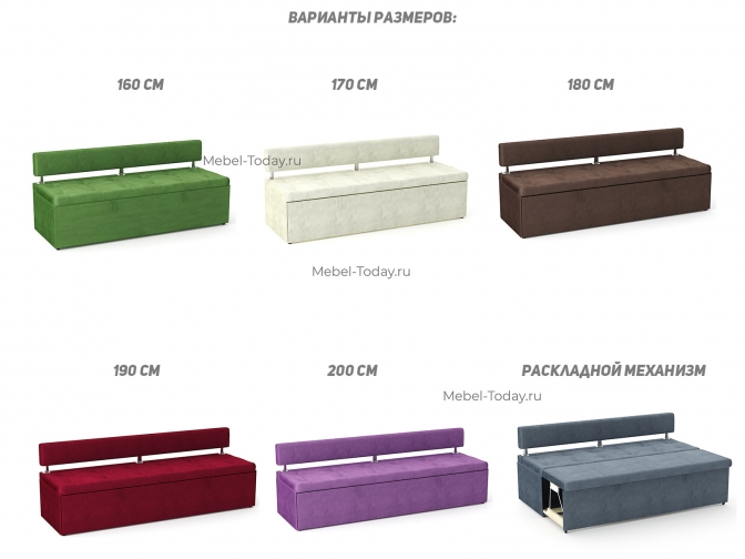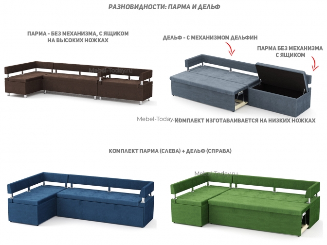 Также есть аналогичный диван Парма без механизма раскладывания (лавка) в трех вариантах: без подлокотников, угловой и с боковинами