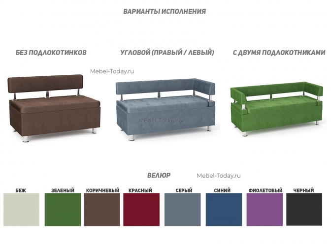 Обивка - велюр бежевый, зеленый, коричневый, красный, серый, синий, фиолетовый, черный. Можно сделать и в других цветах