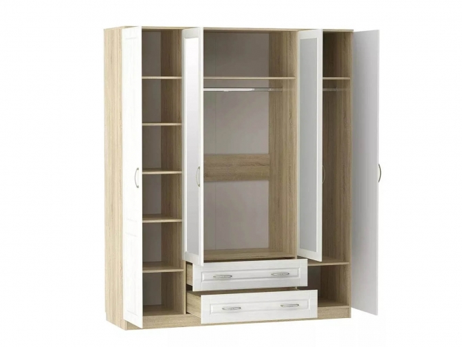 Конструкция с 2-я глухими, 2-я зеркальными дверцами и 2-мя выдвижными ящиками. Внутри две секции, с полками и штангой. Внутри три секции: девять полок для одежды и два отделения с горизонтальными штангами для плечиков.