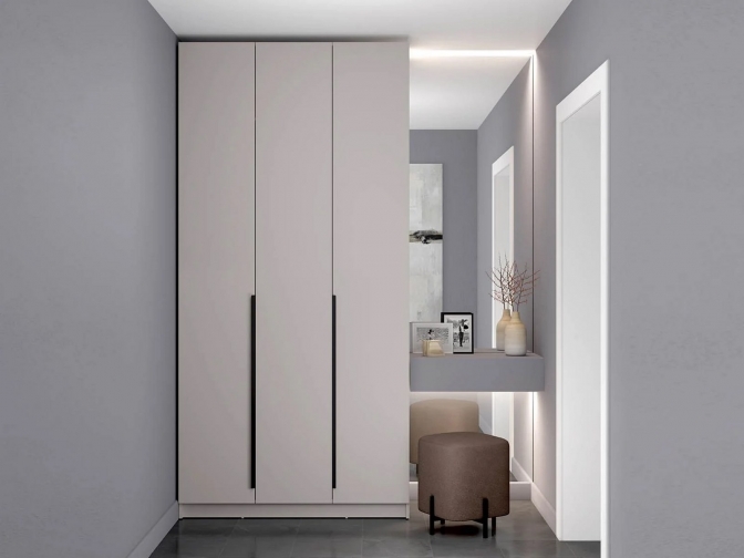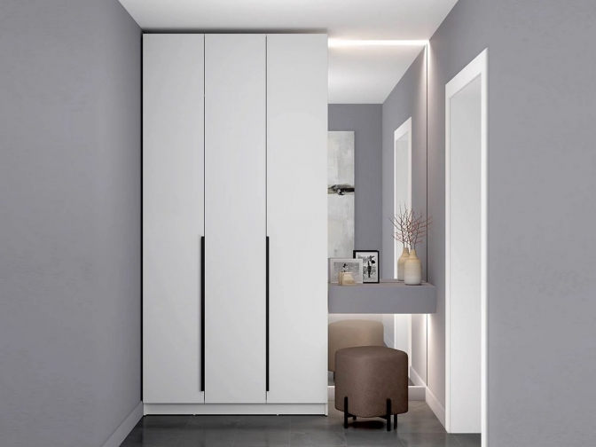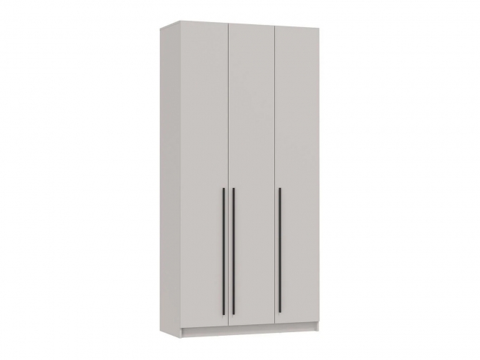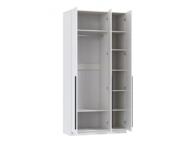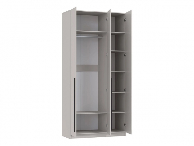 Шкаф с тремя глухими распашными дверцами, внутри полки и штанга для вешалок.