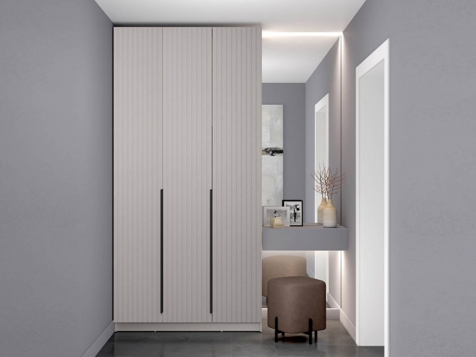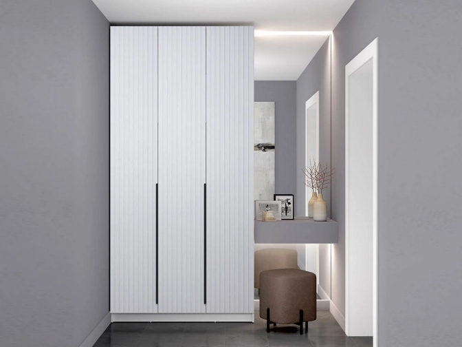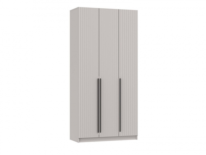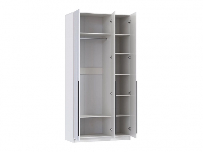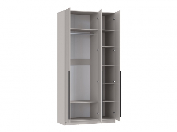 Шкаф с тремя глухими распашными дверцами, внутри полки и штанга для вешалок.