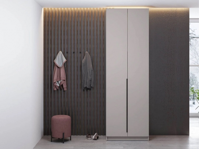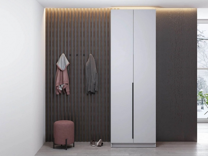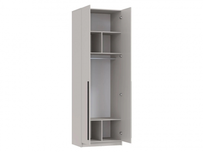 Шкаф с двумя глухими распашными дверцами, внутри — полки и штанга для вешалок.