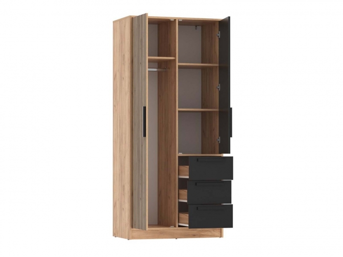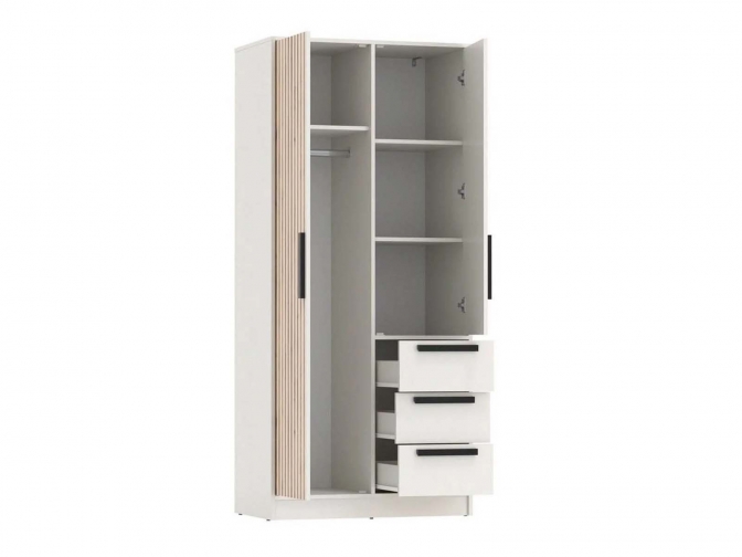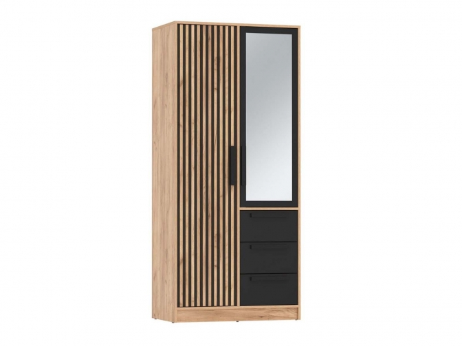 Шкаф для одежды Вегас 83.09 - компактное и практичное решение для хранения вещей. Две распашные дверцы (одна с зеркальной вставкой) открывают доступ к удобному внутреннему пространству: верхняя часть с полками и штангой для плечиков, а внизу расположены три выдвижных ящика.