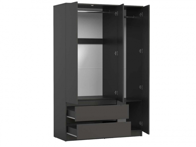 Шкаф для одежды Берген 82.02 Диамант Серый - это функциональное решение для систематизации вещей. Конструкция включает три глухие распашные дверцы. Внутреннее пространство организовано с помощью секций, оснащенных горизонтальными штангами для одежды на плечиках. В нижней части мебели расположены два вместительных выдвижных ящика для хранения различных мелочей.