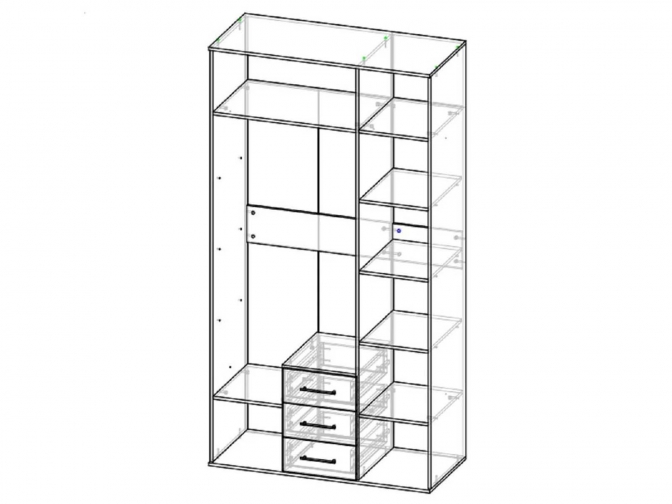 Шкаф Сити 3 - универсальное и вместительное решение для современного интерьера. Три распашные дверцы скрывают продуманное внутреннее пространство: восемь полок, штангу для плечиков. Так же установлены два выдвижных ящика. Комбинированная расцветка завершает стильный облик модели.